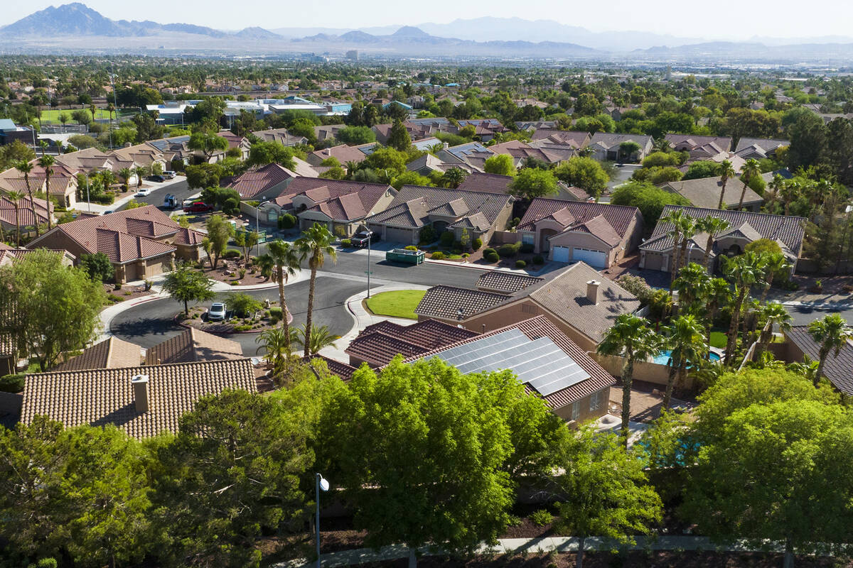The water authority desires to pay Southern Nevadans to plant shade bushes to take care of and develop the area’s tree cover. An aerial view exhibits properties surrounded by bushes at Inexperienced Valley Parkway on Thursday, July 20, 2023, in Henderson. (Bizuayehu Tesfaye/Las Vegas Assessment-Journal) @btesfaye A pedestrian walks on a tree-covered sidewalk alongside Inexperienced Valley Parkway on Thursday, July …